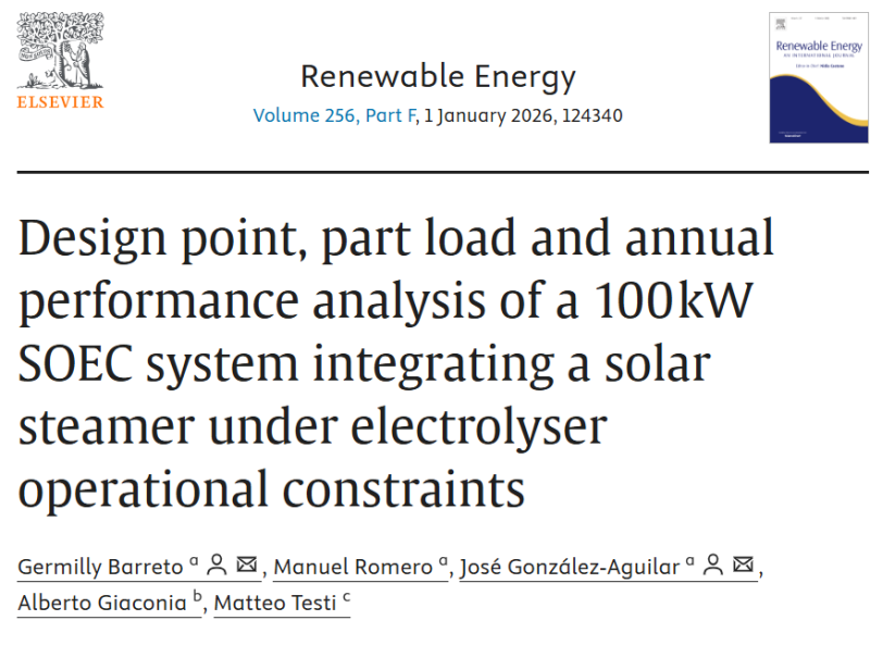 IMDEA Energy in collaboration with FBK and ENEA published the article “Design point, part load and annual performance analysis of a 100 kW SOEC system integrating a solar steamer under electrolyser operational constraints“ on the Renewable Energy journal.