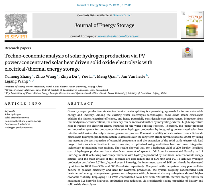 Yumeng Zhang, Zhuo Wang, Zhiyu Du, Yue Li, Meng Qian, Jan Van herle, Ligang Wang (2023). Techno-economic analysis of solar hydrogen production via PV power/concentrated solar heat driven solid oxide electrolysis with electrical/thermal energy storage. Journal of Energy Storage, Volume 72, Part A, 107986, ISSN 2352-152X.