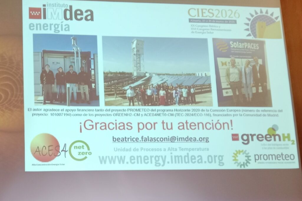 On March 23, Maria Beatrice Falasconi – researcher at IMDEA ENERGY – presented the work “Grid integration strategies for solar-powered hydrogen production: techno-economic insights from Spain and Italy”. At the same time, José González-Aguilar chaired the session “Hidrogeno solar 1”.