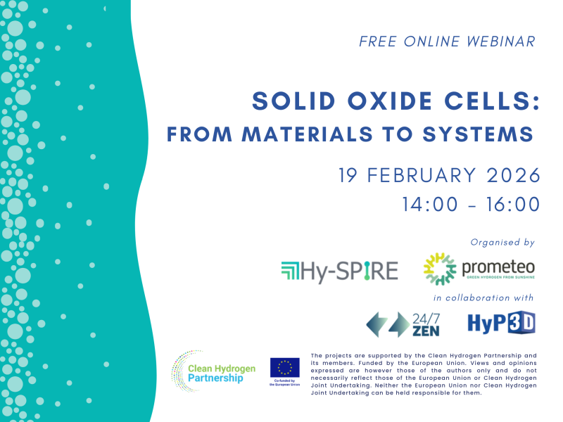 The PROMETEO and Hy-SPIRE projects in collaboration with 24/7 ZEN and HyP3D projects organise the webinar “SOLID OXIDE CELLS: FROM MATERIALS TO SYSTEMS” on February 19 at 2PM.